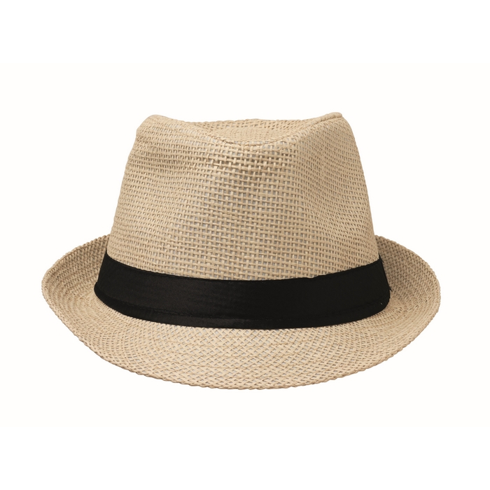 Papírový slaměný klobouk s černým polyesterovým páskem. U objednávek bez potisku se páska dodává nepřipevněná ke klobouku. Rozměry: O27 x 12 cm