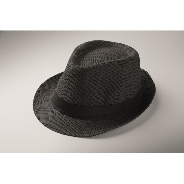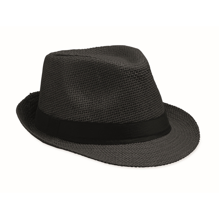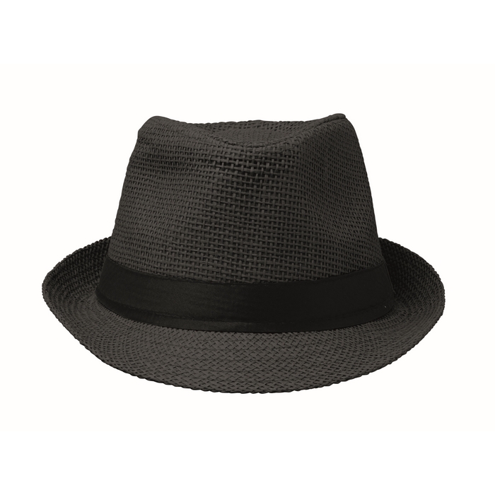 Papírový slaměný klobouk s černým polyesterovým páskem. U objednávek bez potisku se páska dodává nepřipevněná ke klobouku. Rozměry: O27 x 12 cm