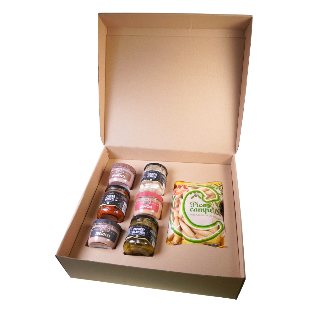 Dárková sada obsahuje kuřecí paštiku, vepřovou paštiku s pepřem, vepřovou paštiku Ibérico z černých prasat, tyčinky picos z olivového oleje, nakládaný česnek, sušená rajčata a jalapeňos. Krabice s víkem je s proložkou na komponenty. Krabici lze potisknout jednobarevným sítotiskem přes celou plochu víka nebo vložit komplimentku do krabice – není zahrnuto v ceně. Minimální odběr od 1 kusu. Dodání 10 dnů. Náhrada produktů vyhrazena dle dostupnosti. Rozměry: 37 × 34 × 11 cm.
