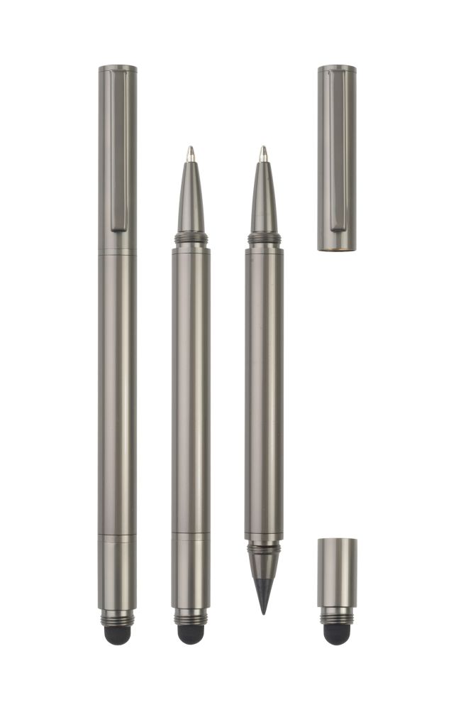 Elegantní kuličkové pero a nekonečná tužka 2 v 1 Pierre Cardin. Pero obsahuje stylus a šroubovací uzávěry, kdy z jedné strany je kuličkové pero a z druhé strany nekonečná tužka. Je navrženo v hladkém gunmetal designu, obsahuje kvalitní modrou náplň s hrotem 1 mm. Baleno v luxusní kapse, dodáváno s certifikátem pravosti.