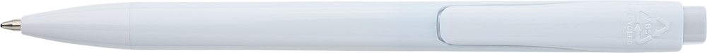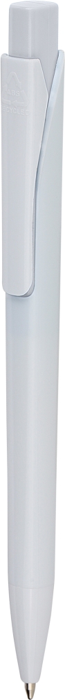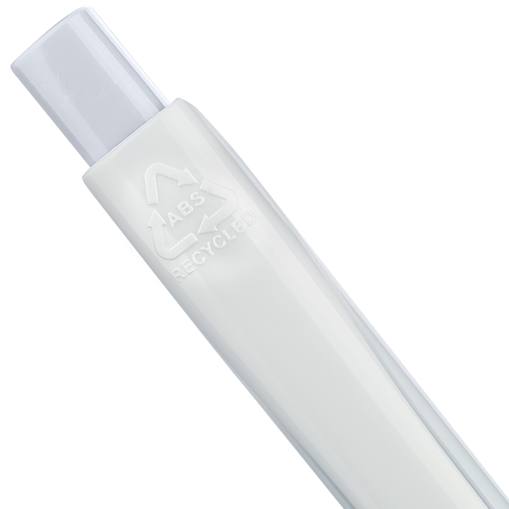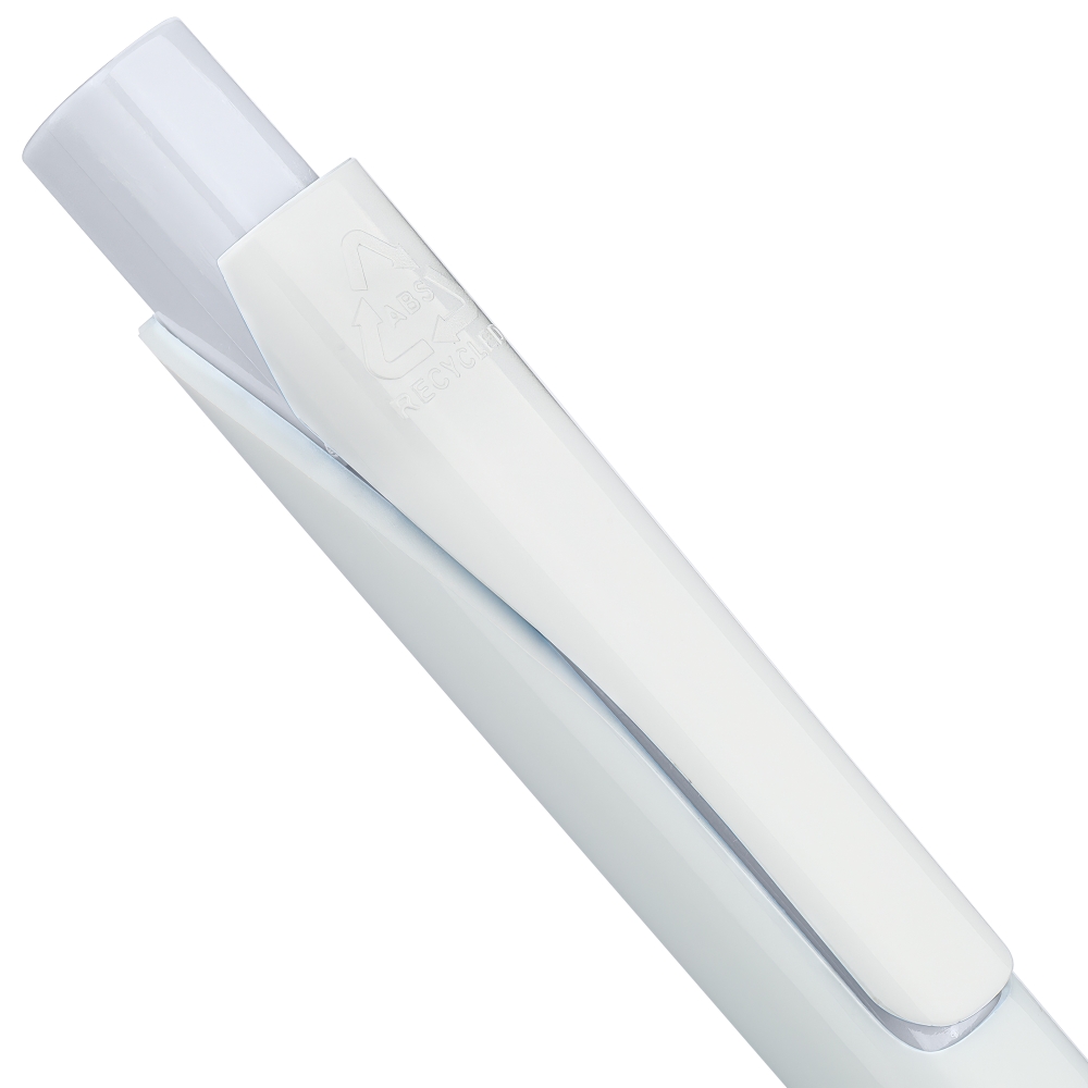 Propiska s plným bílým tělem a barevným detailem tlačítka. Vyrobena z recyklovaného ABS plastu, což snižuje množství plastového odpadu a zároveň zachovává vysokou odolnost proti nárazu a dlouhou životnost. Má klikací mechanismus, klip a zalité logo z recyklovaného ABS plastu na horní straně tlačítka. Vybaveno modrým německým inkoustem Dokumental. Rozměry: 1,2 x 14 cm