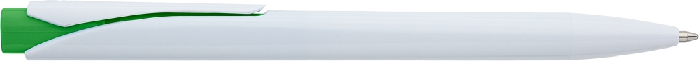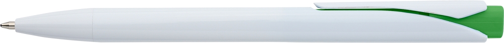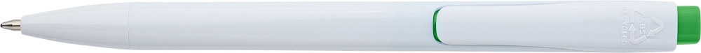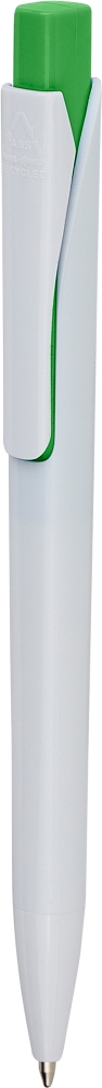 Propiska s plným bílým tělem a barevným detailem tlačítka. Vyrobena z recyklovaného ABS plastu, což snižuje množství plastového odpadu a zároveň zachovává vysokou odolnost proti nárazu a dlouhou životnost. Má klikací mechanismus, klip a zalité logo z recyklovaného ABS plastu na horní straně tlačítka. Vybaveno modrým německým inkoustem Dokumental. Rozměry: 1,2 x 14 cm
