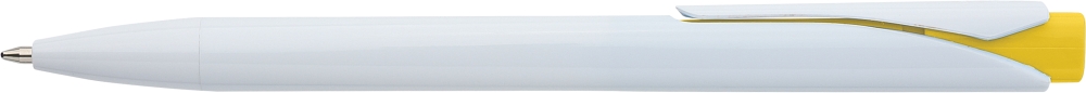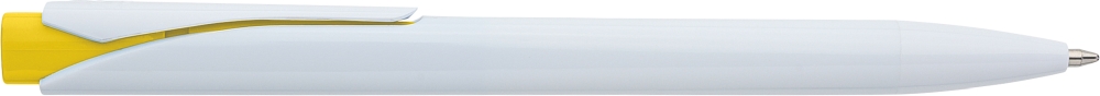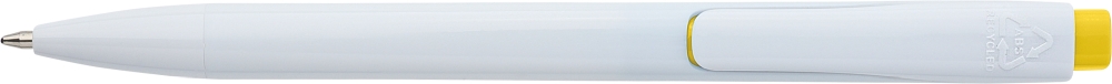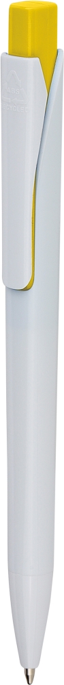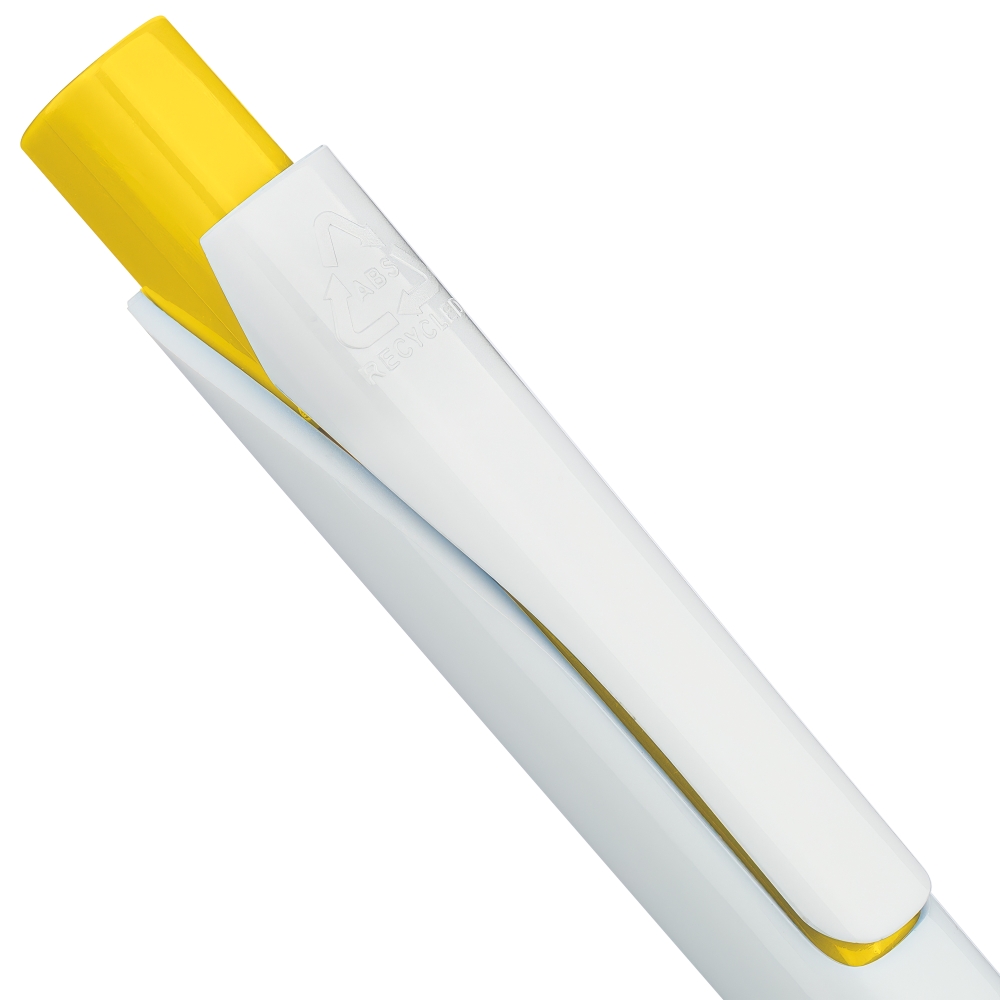 Propiska s plným bílým tělem a barevným detailem tlačítka. Vyrobena z recyklovaného ABS plastu, což snižuje množství plastového odpadu a zároveň zachovává vysokou odolnost proti nárazu a dlouhou životnost. Má klikací mechanismus, klip a zalité logo z recyklovaného ABS plastu na horní straně tlačítka. Vybaveno modrým německým inkoustem Dokumental. Rozměry: 1,2 x 14 cm