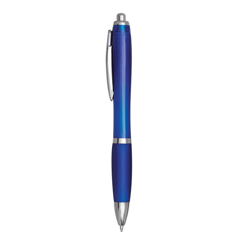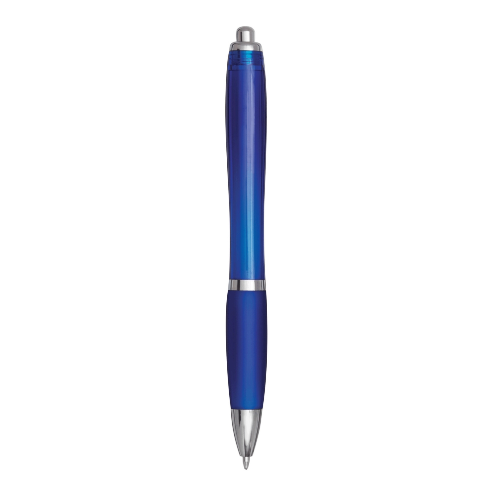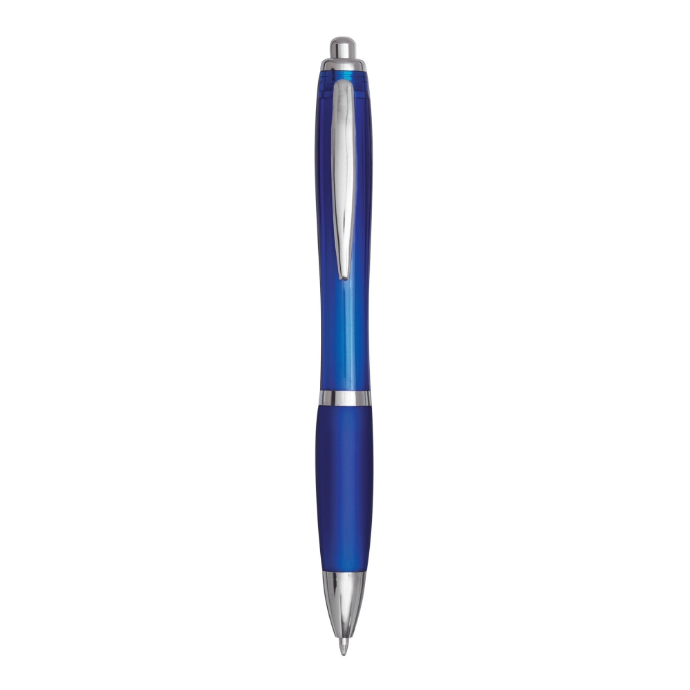 Propiska se zaobleným tělem z recyklovaného plastu, pogumovaná rukojeť, klikací mechanismus, velká náplň, modrý inkoust. Rozměry: 14 cm