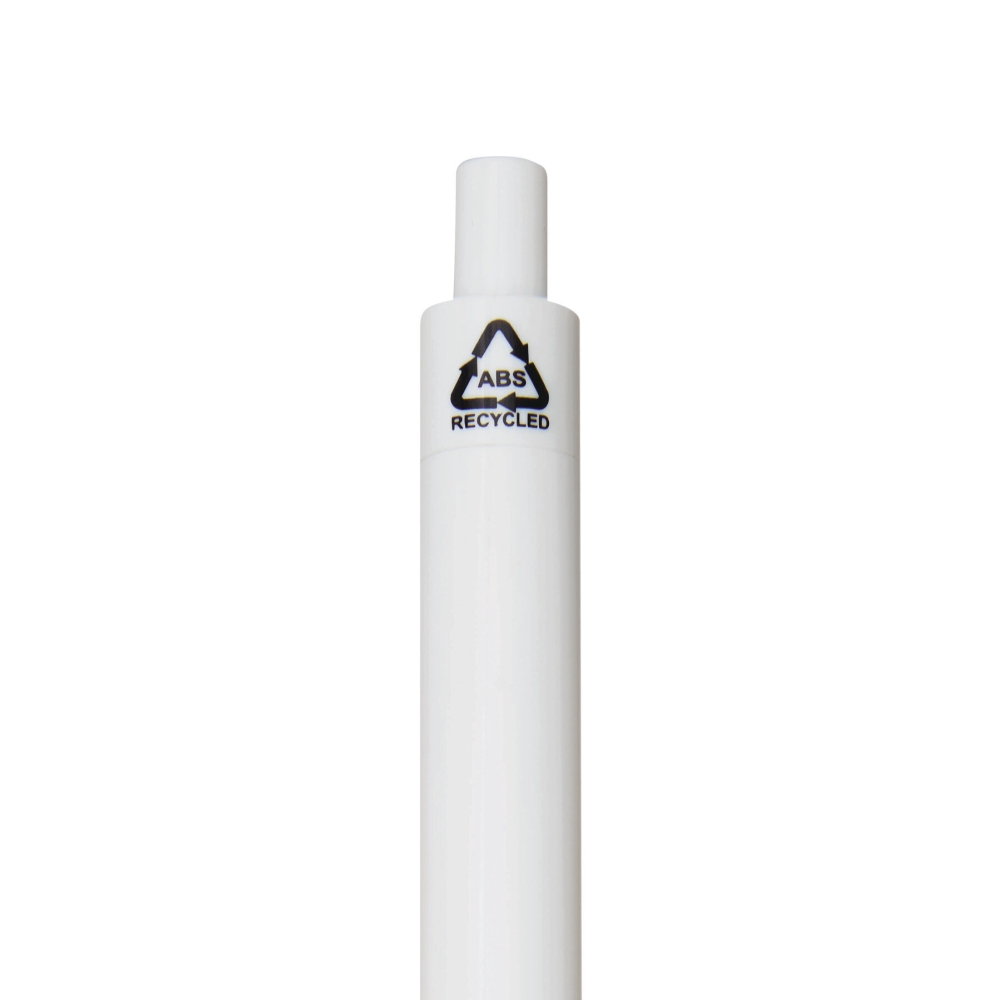 Propiska z recyklovaného plastu, žebrovaná úchopová zóna, klikací mechanismus, modrý inkoust. Rozměry: 13,7 cm