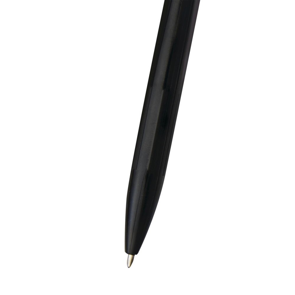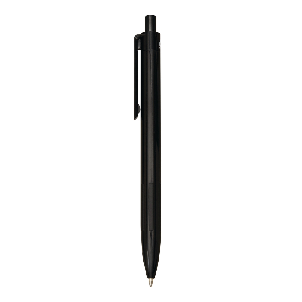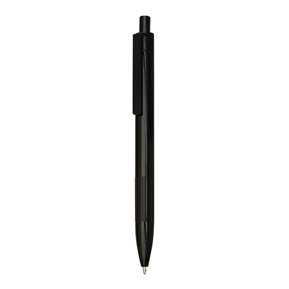 Propiska z recyklovaného plastu, žebrovaná úchopová zóna, klikací mechanismus, modrý inkoust. Rozměry: 13,7 cm