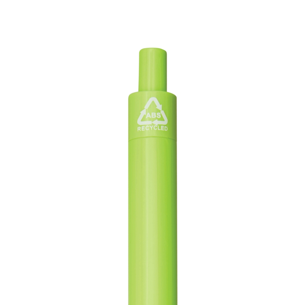Propiska z recyklovaného plastu, žebrovaná úchopová zóna, klikací mechanismus, modrý inkoust. Rozměry: 13,7 cm