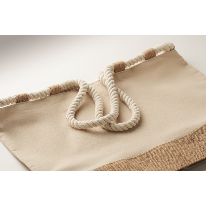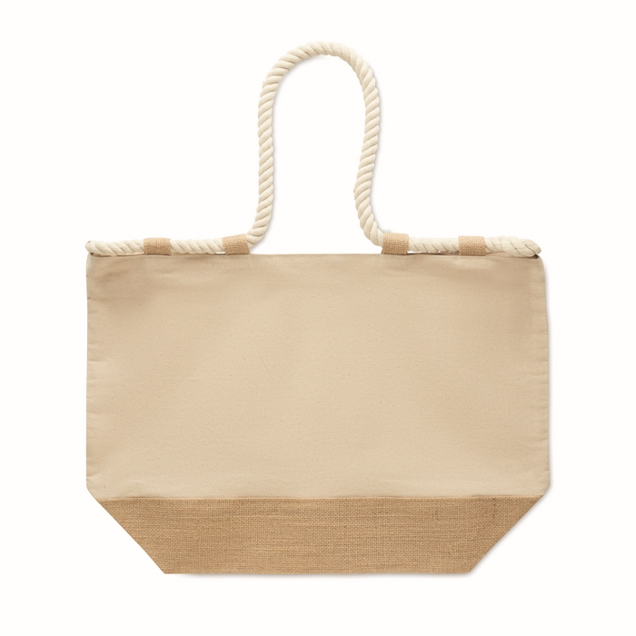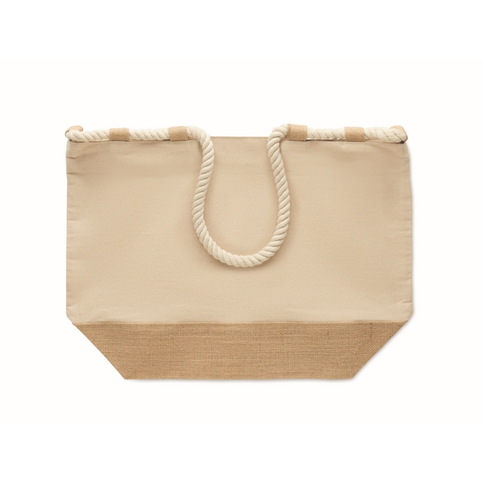 Plážová taška z 280g bavlněného plátna a juty s držadly ze šňůry. Zapínání na zip. Dno potažené jutou. Rozměry: 50 x 17.5 x 34 cm