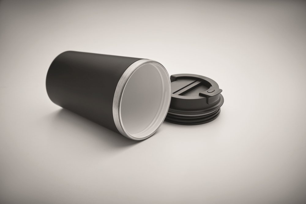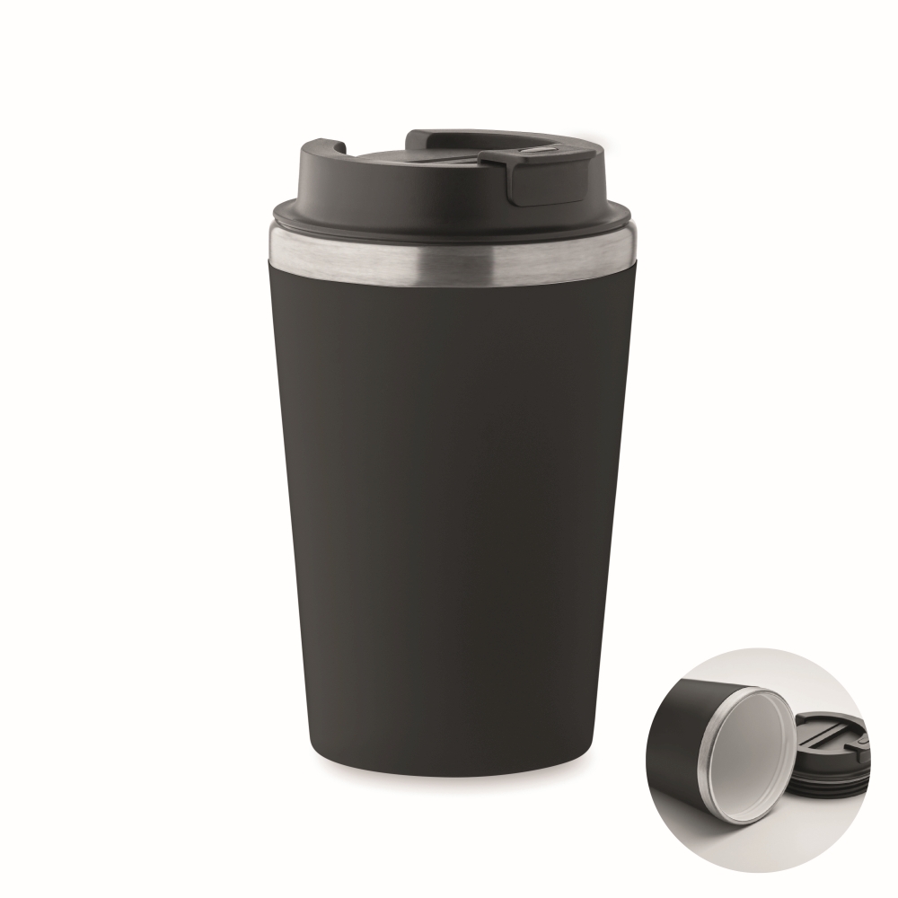 Dvoustěnný pohárek s vnější stěnou z PP a vnitřní stěnou z recyklované nerezové oceli (90 % recyklované nerezové oceli a 10 % nerezové oceli) s keramickou vrstvou. Neteče. Objem: 350 ml. Rozměry: O 8,5 x 14 cm