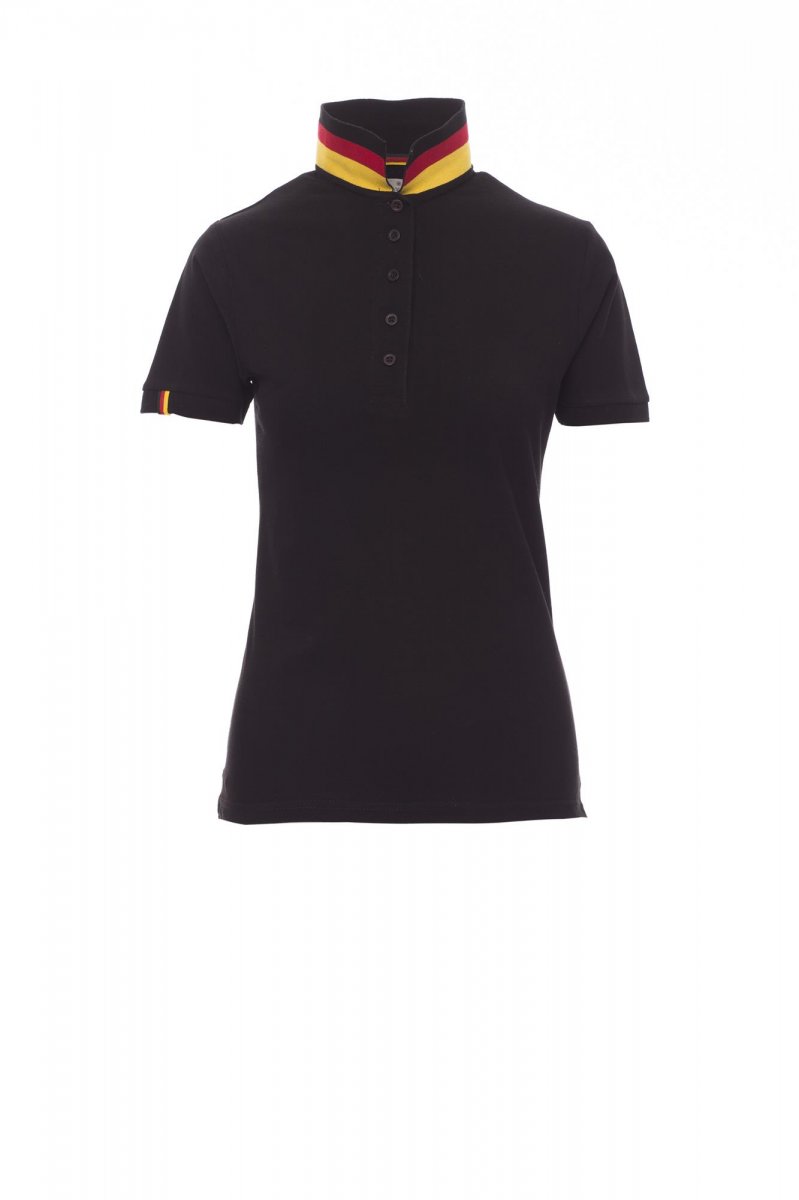 Dámská vyštíhlená polokošile s krátkým rukávem s 5 barevně sladěnými perleťovými knoflíky, barevně sladěný límeček s kontrastním rubem v barvách italské vlajky, který je vidět pouze při zvednutí, barevně lemovaný pravý rukáv ve stejné barvě jako límeček, žebrovaný límeček a lemy rukávů, postranní rozparky v barvách italské vlajky, skryté prošití límečku s žerzejovým úpletem rovněž v barvách vlajky, postranní vyztužovací páska, tvarovaná výztuž na spodní straně límečku.