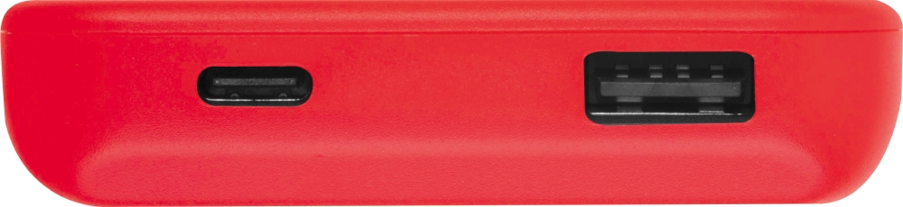 Powerbanka (10 000 mAh) z recyklovaného plastu se dvěmi porty: USB-C in/out 5V/2,1A a USB-A out 5V/2,1A. Obsahuje 50 cm nabíjecí kabel. Rozměry: 13,5 x 6,5 x 1,5 cm