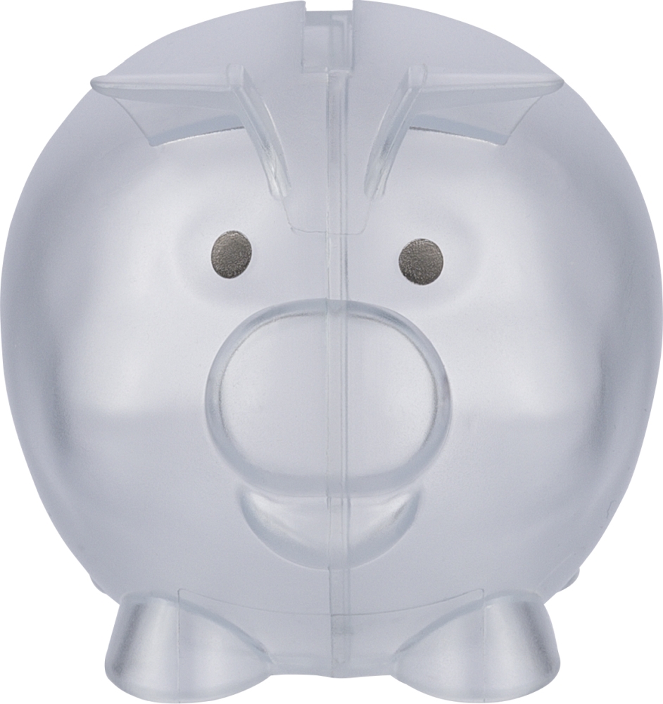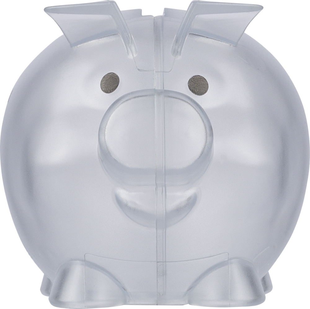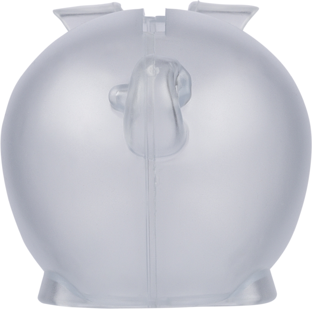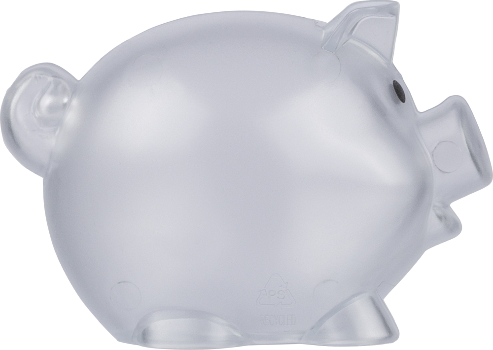 Recyklovaná plastová pokladnička ve tvaru prasete. Průhledná verze s recyklovaným logem na zadní straně. Rozměry: 7,1 cm x 9,5 cm
