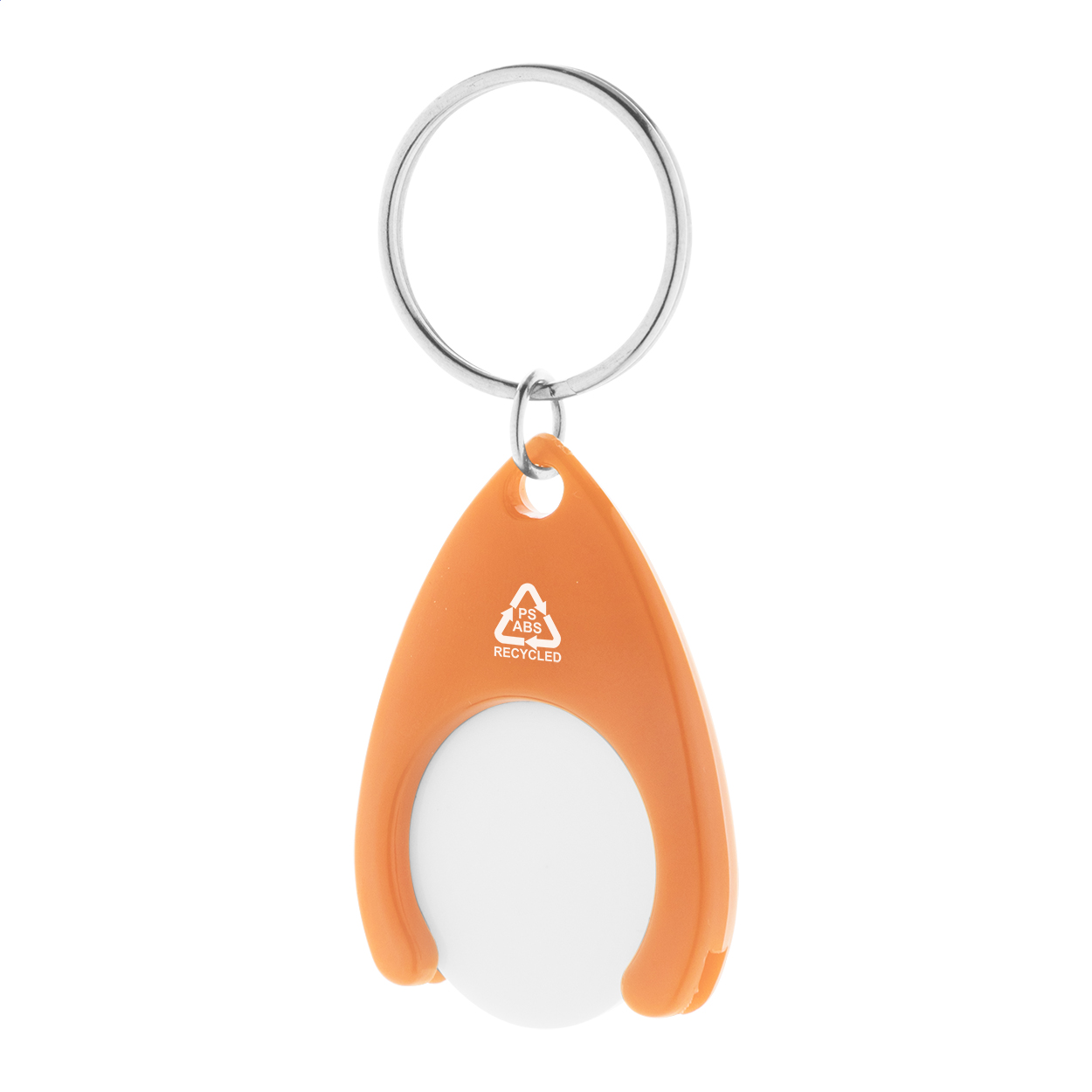 Přívěšek na klíče z recyklovaného ABS plastu s mincí do nákupního vozíku a kovovým kroužkem. Velikost mince: o 2,4 × 0,2 cm. Rozměr: 3,3x4,4x0,55 cm