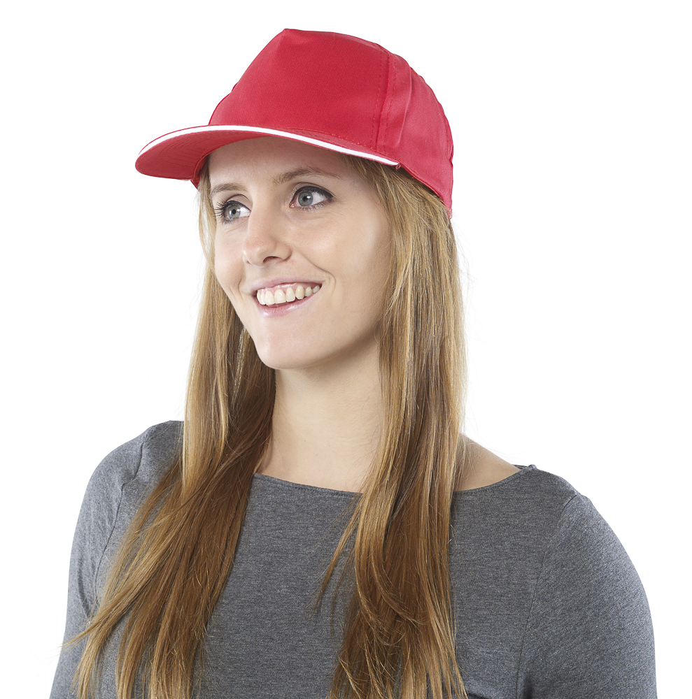 Pětipanelová bavlněná čepice se sendvičovým kšiltem a zapínáním na suchý zip. Materiál 100% bavlna. Rozměry: O 19 × 13 cm.