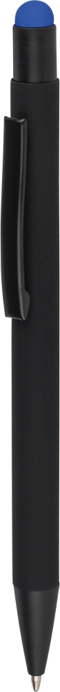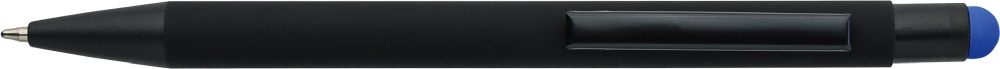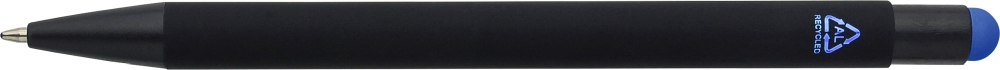 Propiska z recyklovaného hliníku s černou pogumovanou povrchovou úpravou a modrým inkoustem. Navržena s barevnými akcenty, včetně vnitřního těla a dotykového hrotu, které po gravírování vytvářejí jemný kontrast. Má stiskací mechanismus a je zakončena gravírovaným logem z recyklovaného materiálu. Rozměry: 1 x 1,4 x 14,1 cm