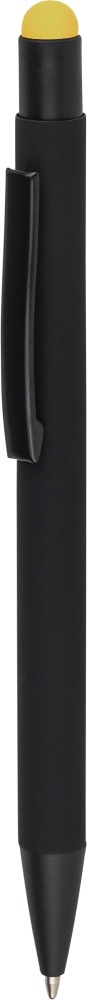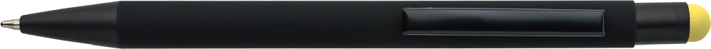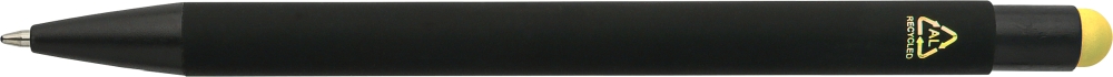 Propiska z recyklovaného hliníku s černou pogumovanou povrchovou úpravou a modrým inkoustem. Navržena s barevnými akcenty, včetně vnitřního těla a dotykového hrotu, které po gravírování vytvářejí jemný kontrast. Má stiskací mechanismus a je zakončena gravírovaným logem z recyklovaného materiálu. Rozměry: 1 x 1,4 x 14,1 cm