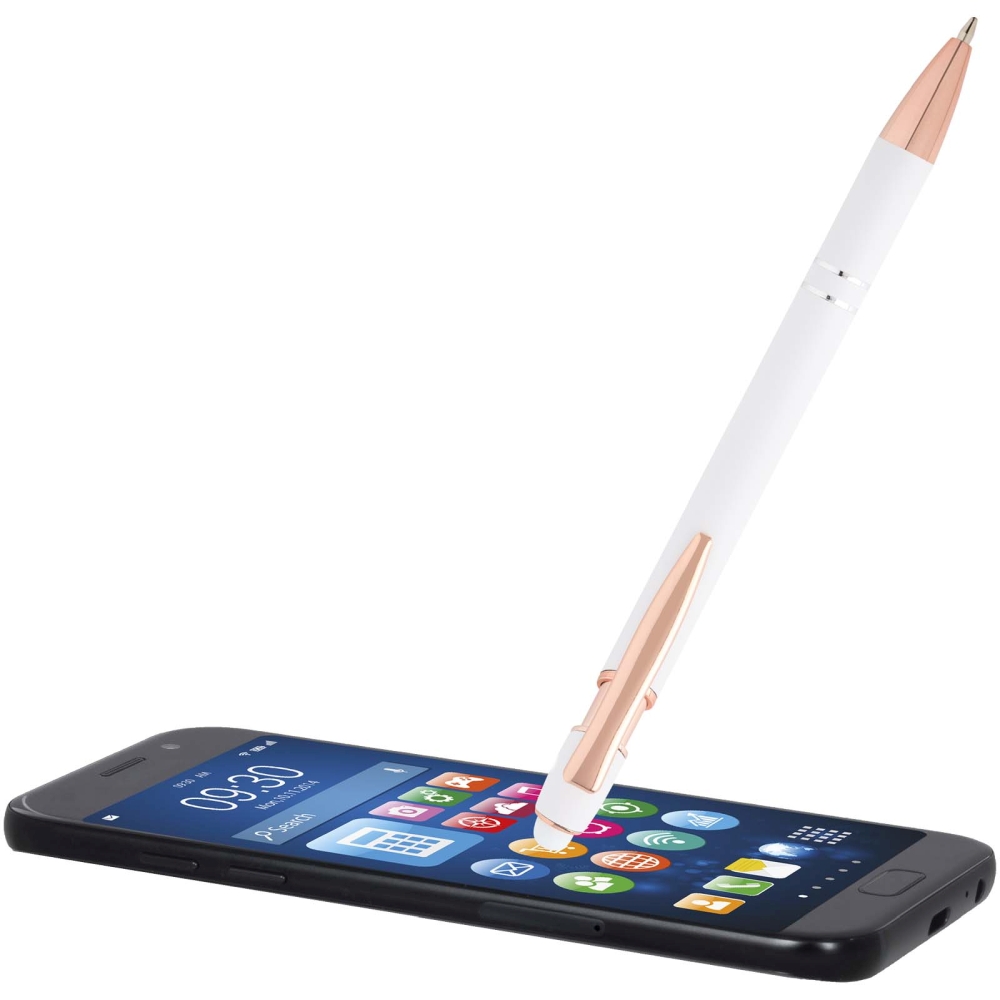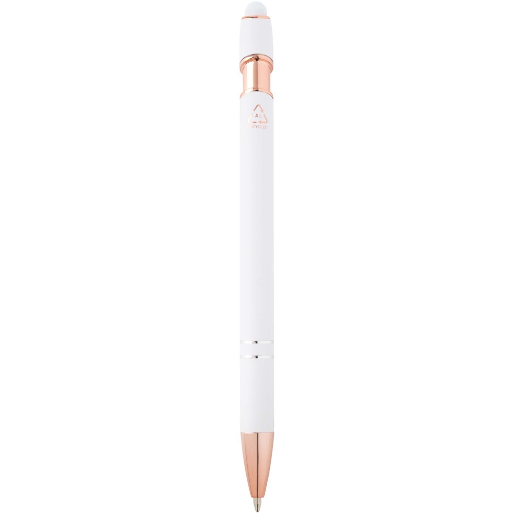Propiska s povrchovou úpravou z růžového zlata má tělo vyrobené z recyklovaného hliníku a dotykový stylus vyrobený ze silikonu. Snižuje také množství odpadu na skládkách a pomáhá šetřit přírodní zdroje s cílem snížit emise skleníkových plynů. Barva inkoustu: Modrá. Délka psaní: 800 metrů. Rozměr hrotu: 1,0 mm. Rozměry: 14,4 x O 1 cm