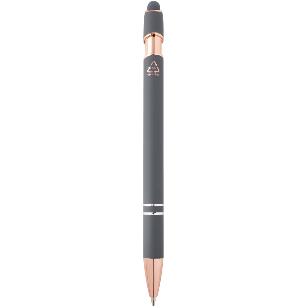 Propiskas povrchovou úpravou z růžového zlata má tělo vyrobené z recyklovaného hliníku a dotykový stylus vyrobený ze silikonu. Snižuje také množství odpadu na skládkách a pomáhá šetřit přírodní zdroje s cílem snížit emise skleníkových plynů. Barva inkoustu: Černá. Délka psaní: 800 metrů. Rozměr hrotu: 1,0 mm. Rozměry: 14,4 x O 1 cm