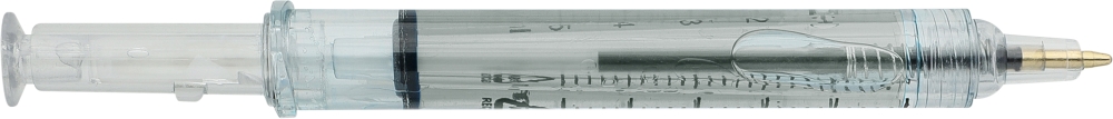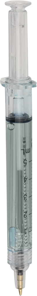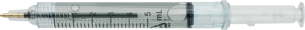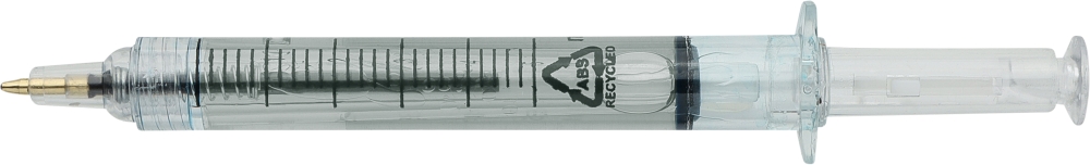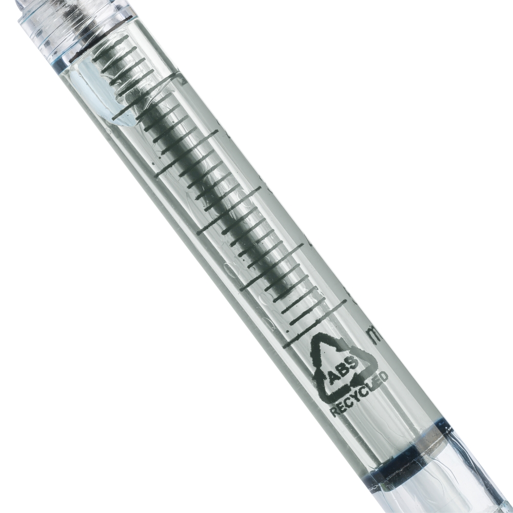 Propiska ve tvaru injekční stříkačky, naplněná barevnou tekutinou pro hravý a poutavý vzhled. Vyrobena z recyklovaného ABS plastu, čímž se snižuje množství plastového odpadu a zároveň si zachovává vysoká odolnost proti nárazu a dlouhotrvající životnost. Vybavena černou náplní a stiskacím mechanismem. Součástí je stylus pro použití na kapacitních dotykových obrazovkách. Povrchová úprava s vlitým logem z recyklovaného ABS plastu. Rozměry: 1,2 x 2 x 12,9 cm