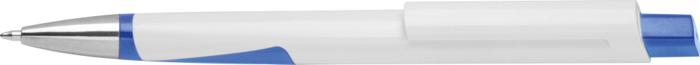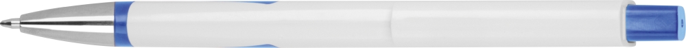 Bílá propiska z recyklovaného plastu s modrou náplní. Rozměry: 14,5 x 1,1 x 1 cm
