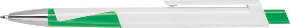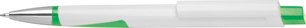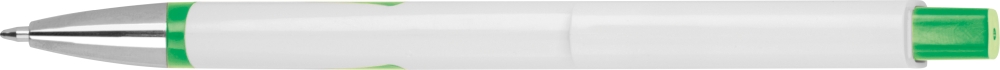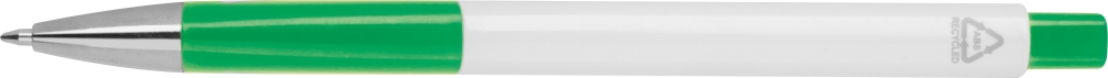 Bílá propiska z recyklovaného plastu s modrou náplní. Rozměry: 14,5 x 1,1 x 1 cm