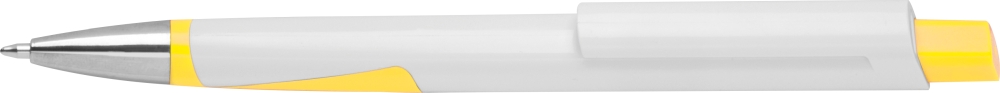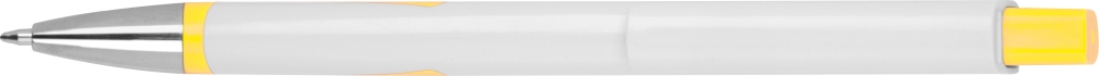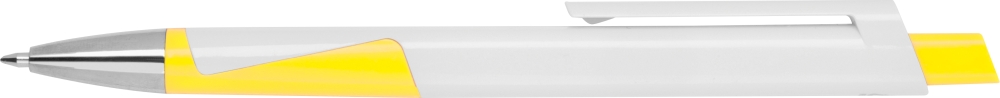 Bílá propiska z recyklovaného plastu s modrou náplní. Rozměry: 14,5 x 1,1 x 1 cm