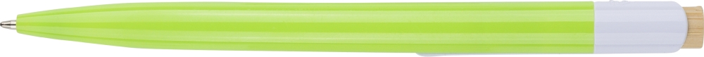 Propiska z recyklovaného ABS plastu s bambusovým tlačítkem a bílým klipem, vhodné pro digitální tisk. Přibližná délka psaní 600 metrů. Modrý inkoust. Rozměry: 1 cm x 1,4 cm x 14,4 cm.
