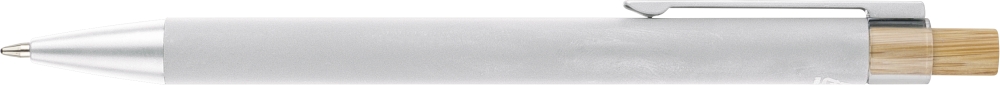 Propiska z recyklovaného hliníku s bambusovým tlačítkem a detailem z AS plastu. Součástí je kovový klip a plastový hrot, obojí ve sladěných barvách. Na těle je laserově gravírované recyklované logo. Přibližná délka psaní 800 metrů. Modrý inkoust. Rozměry: 1 cm x 1,25 cm x 14 cm.