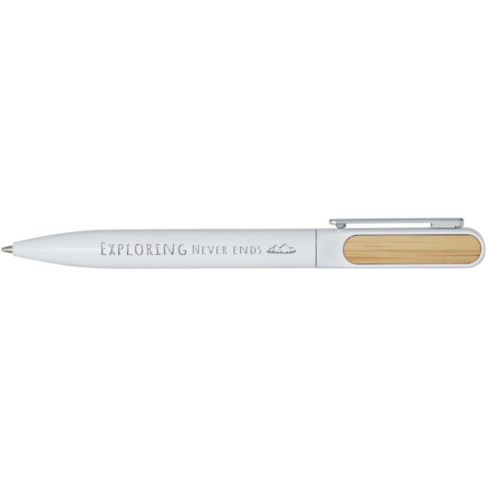 Propiska má horní část těla vyrobenou z recyklovaného plastu s barevným nástřikem a bambusové doplňky na obou stranách. Spodní část těla je vyrobena z recyklovaného hliníku s barevným nástřikem. Barva inkoustu: Modrá. Délka psaní: 400 metrů. Rozměr hrotu: 1,0 mm. Rozměry: 14 x O 1,2 cm