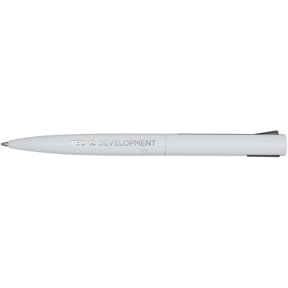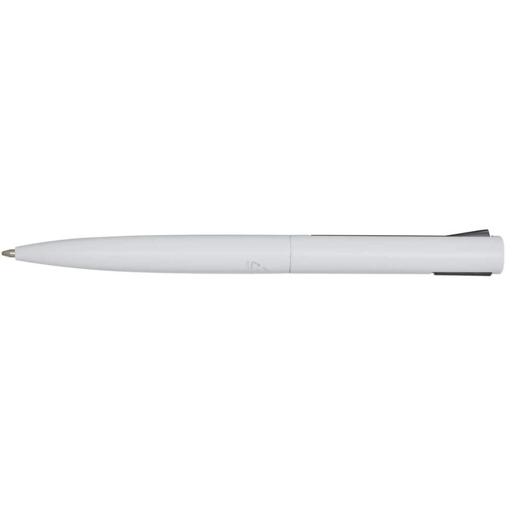 Propiska s horní částí těla vyrobenou z recyklovaného plastu a spodní částí z recyklovaného hliníku. Spona je vyrobena ze železa. Barva inkoustu: Modrá. Délka psaní: 1000 metrů. Rozměr hrotu: 1,0 mm. Rozměry: 14,5 x O 1,5 cm