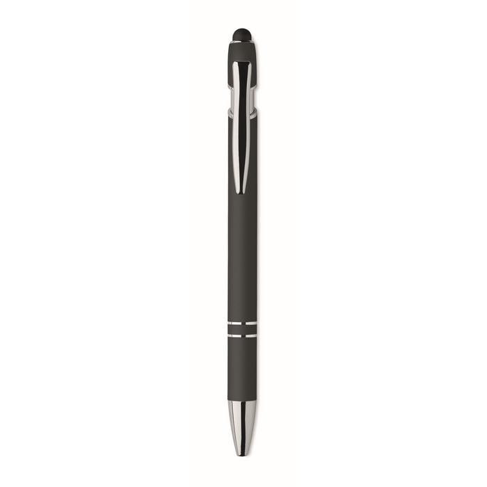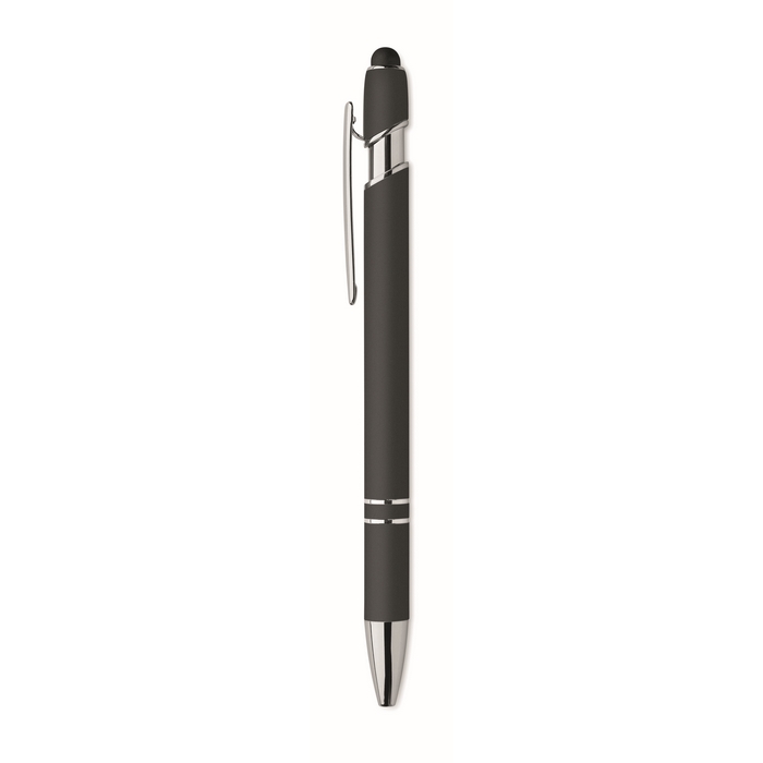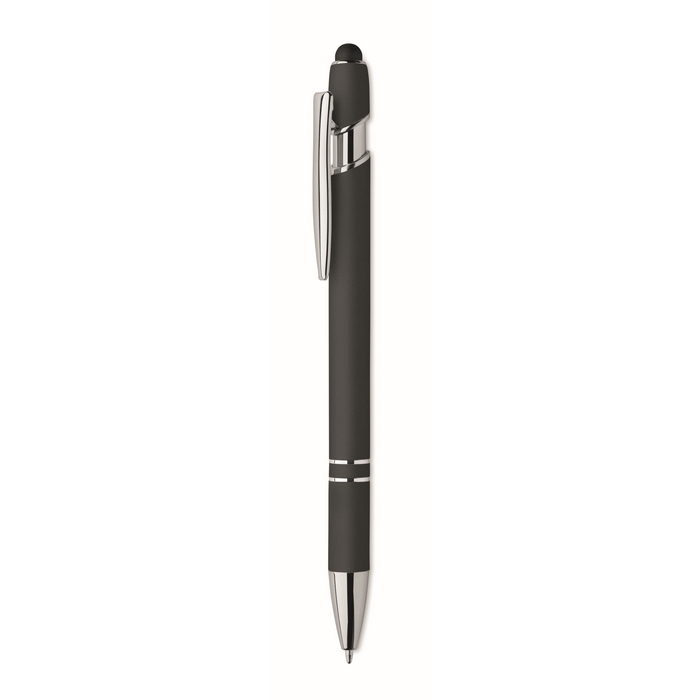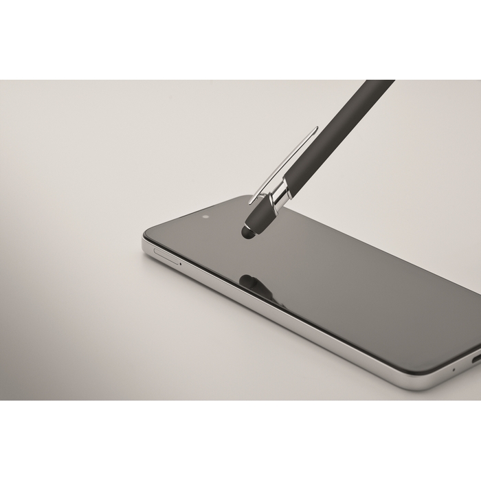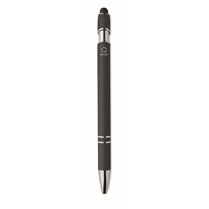 Kuličkové pero z recyklovaného hliníku, se stylusem. Modrý inkoust. Rozměry: 14 x 1 cm