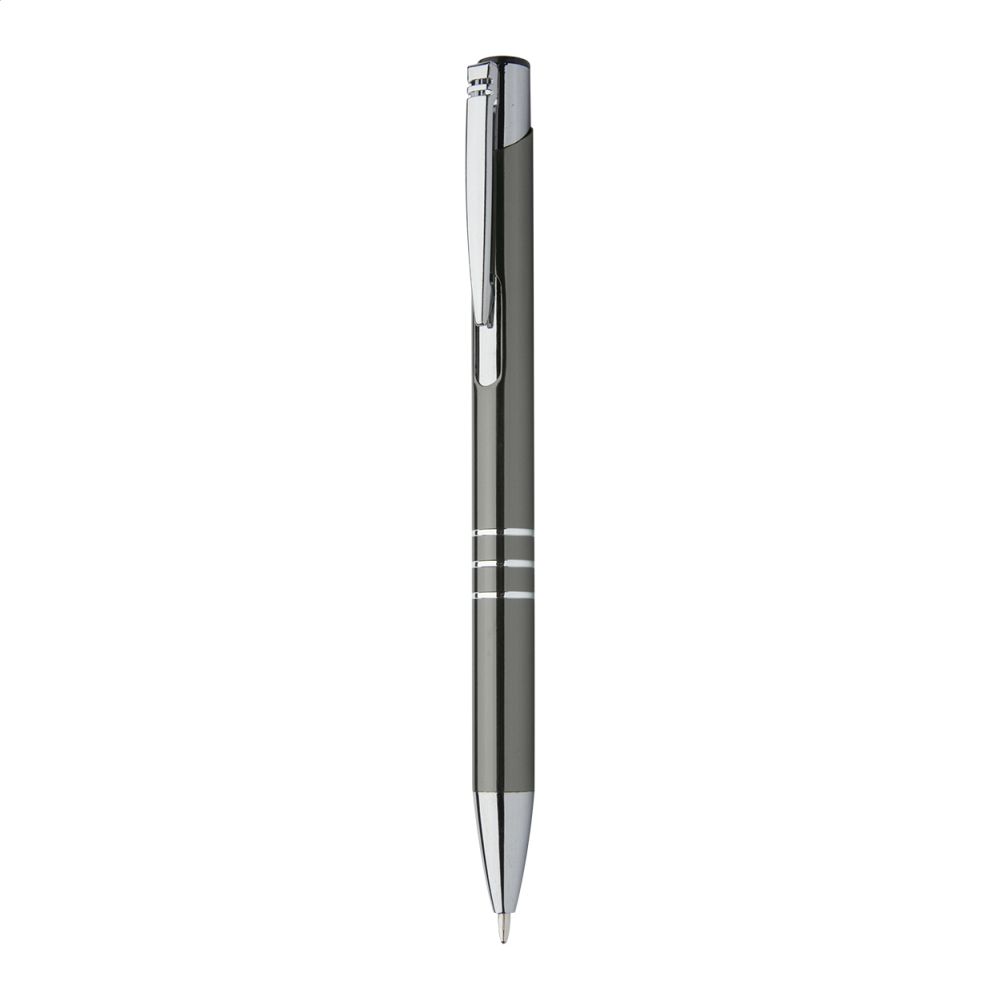 Kuličkové pero z recyklovaného hliníku s metalickým povrchem a modrou náplní. Rozměry: o 1,1 × 13,8 cm.