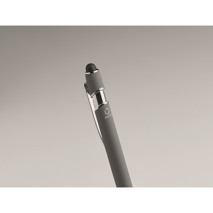 Kuličkové pero z recyklovaného hliníku, se stylusem. Modrý inkoust. Rozměry: 14 x 1 cm