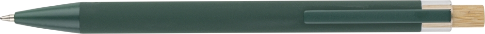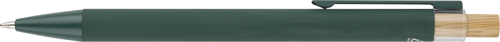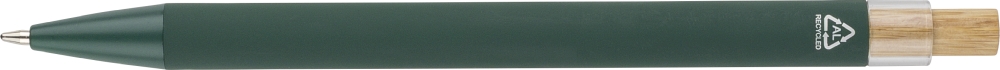 Propiska z recyklovaného hliníku s bambusovým tlačítkem a detailem z AS plastu. Součástí je kovový klip a plastový hrot, obojí ve sladěných barvách. Na těle je laserově gravírované recyklované logo. Přibližná délka psaní 800 metrů. Modrý inkoust. Rozměry: 1 cm x 1,25 cm x 14 cm.