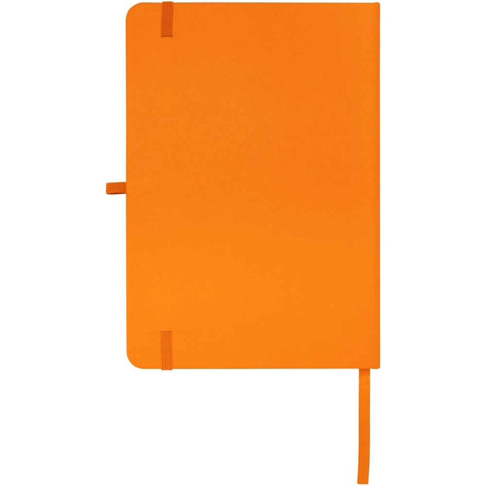 Zápisník A5 s pevnou obálkou z lepenky a zaoblenými rohy je nejen skvělým pomocníkem v kanceláři, ale také ideální příležitostí k propagaci vaší značky. Zápisník má 96 linkovaných listů papíru o gramáži 70 g/m2 a obálkou měkkou na dotek. Dodává se s poutkem na pero, elastickým uzávěrem a záložkou. Rozměry: 21,2 x 14,6 cm