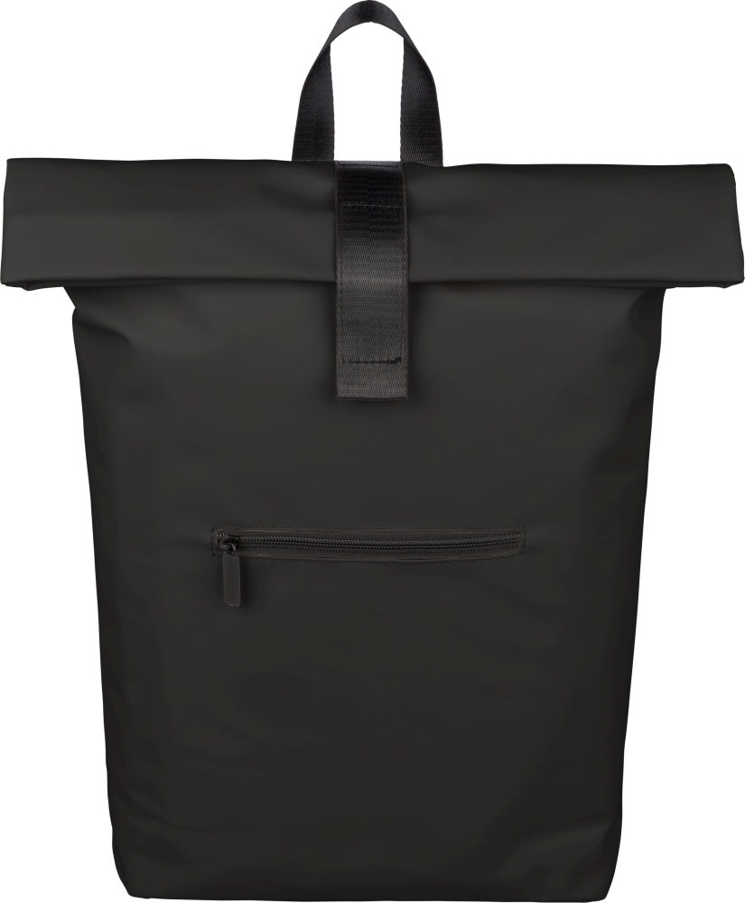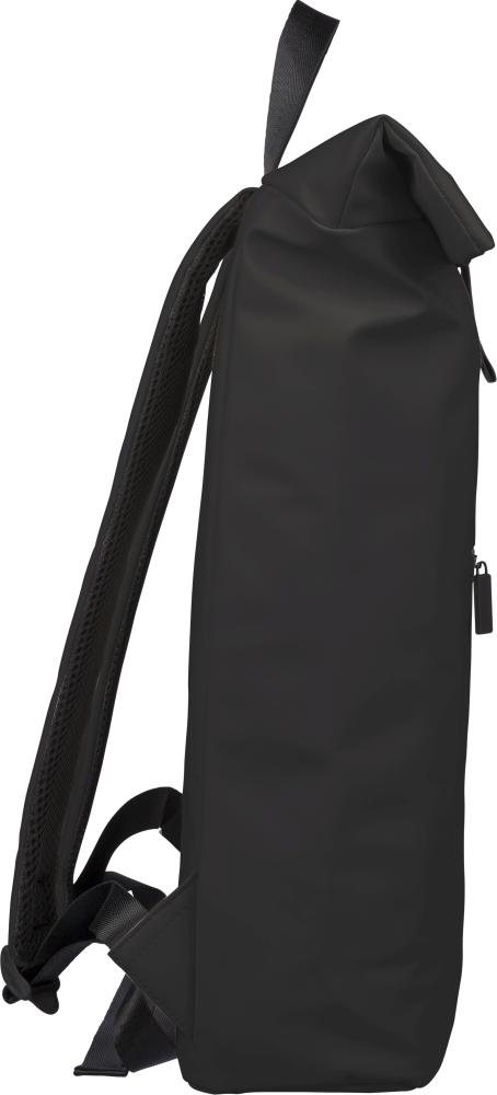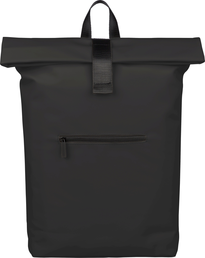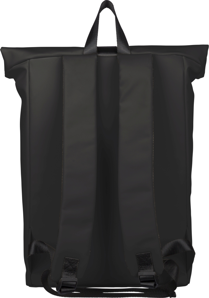 Batoh z recyklovaného PU (19 l) s rolovacím zapínáním a suchým zipem. Má přední kapsu na zip, přihrádku na 16" notebook, podšívku z recyklovaného materiálu 210D, nastavitelné odvětrávané ramenní popruhy, horní rukojeť a uvnitř jeden recyklovaný štítek. Rozměry: 55 cm x 30 cm