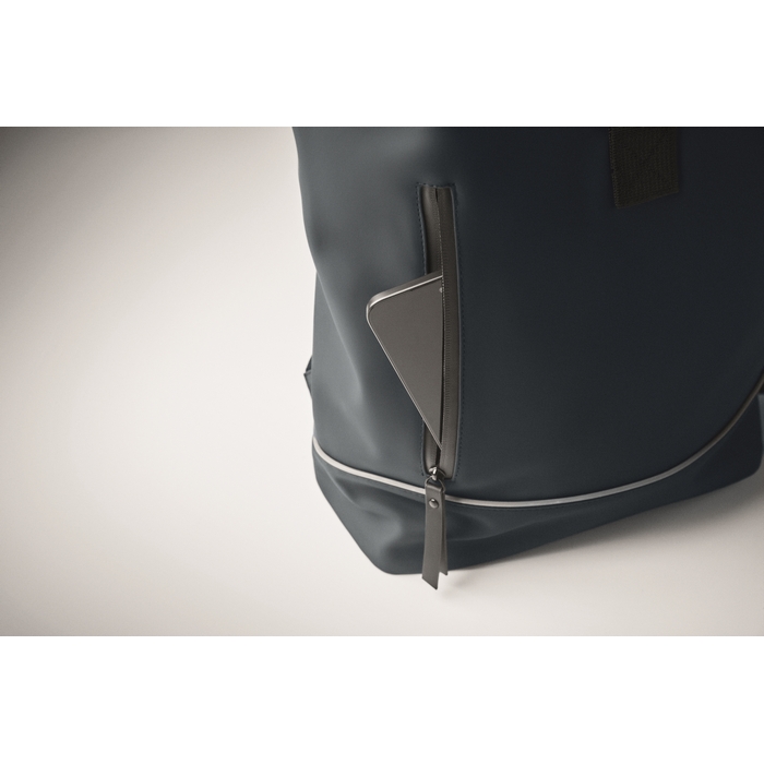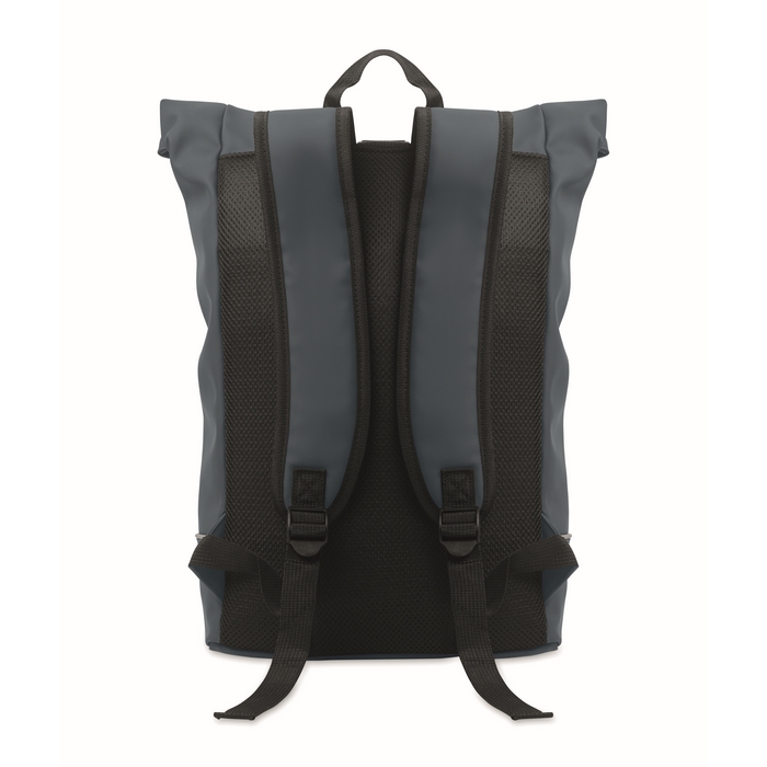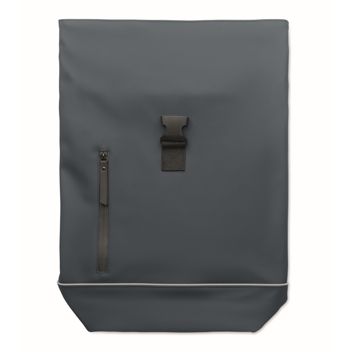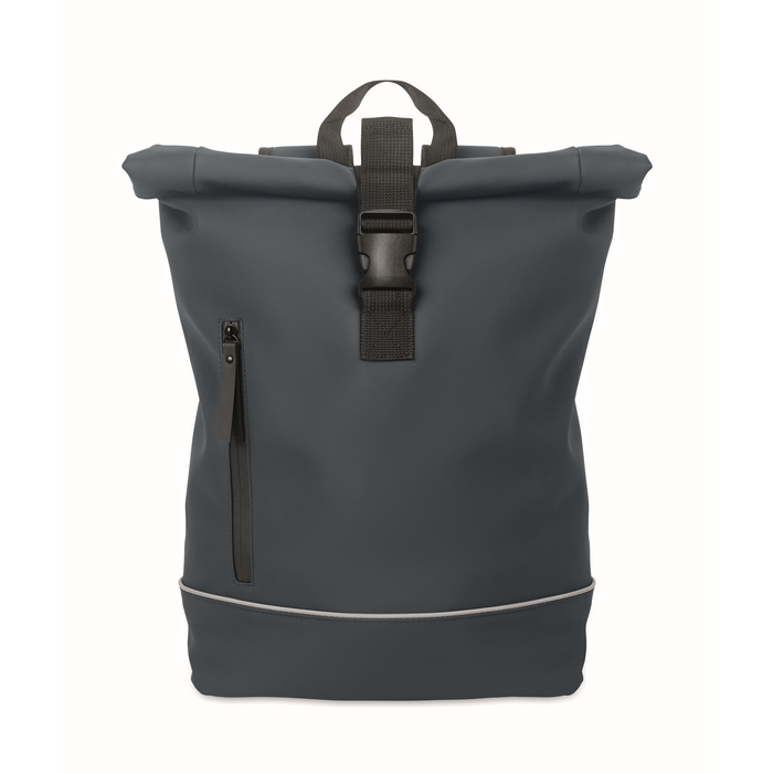 Rolovací batoh na 15palcový notebook z měkkého PU s polstrovanými zády a zesílenou základnou s reflexním pruhem. Vodotěsná přední kapsa na zip. Podšívka z polyesteru 210D RPET. Rozměry: 40 x 12 x 54 cm
