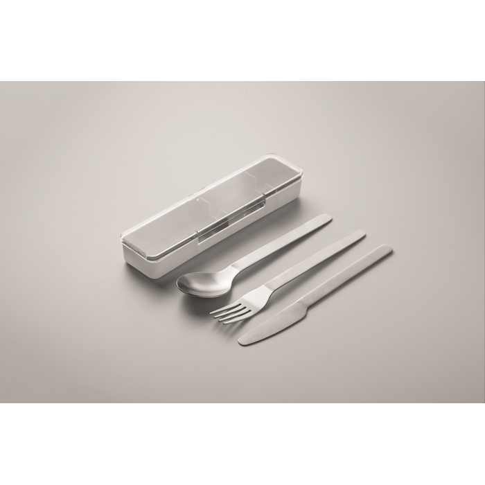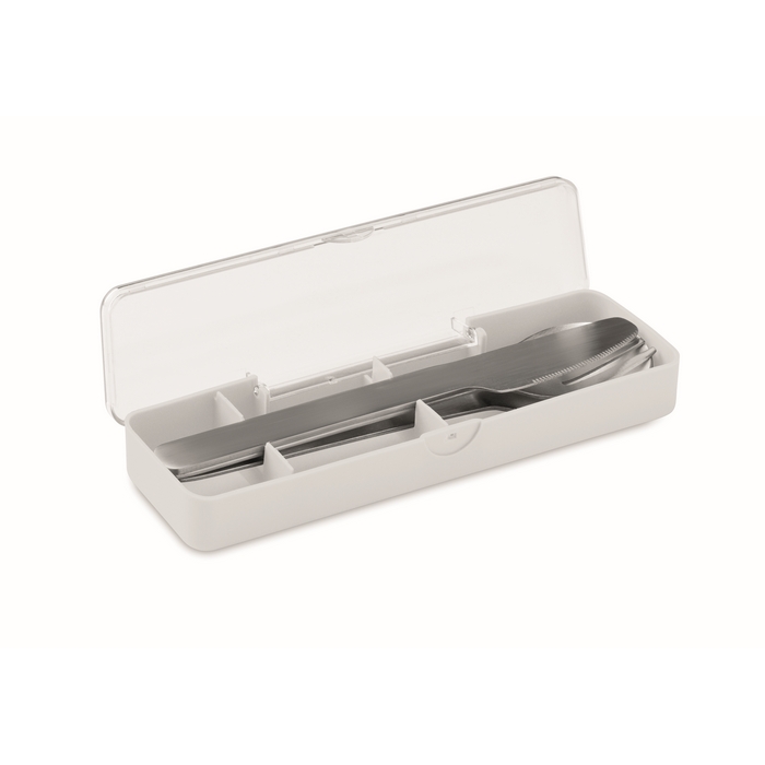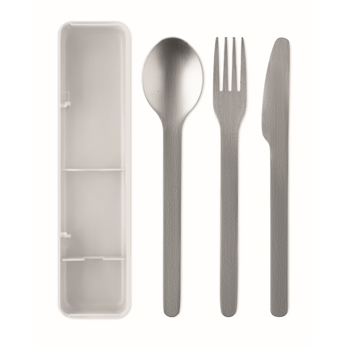 Sada příborů z nerezové oceli v pouzdru z PP. Obsahuje vidličku, nůž a lžíci. Rozměry: 19.5 x 5.2 x 2 cm