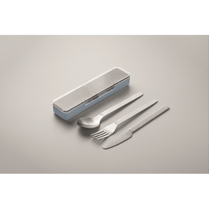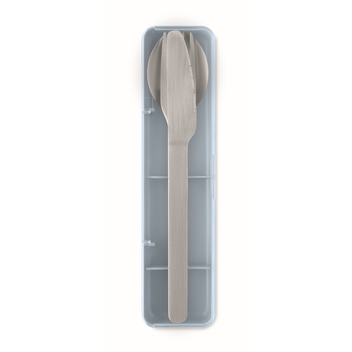 Sada příborů z nerezové oceli v pouzdru z PP. Obsahuje vidličku, nůž a lžíci. Rozměry: 19.5 x 5.2 x 2 cm