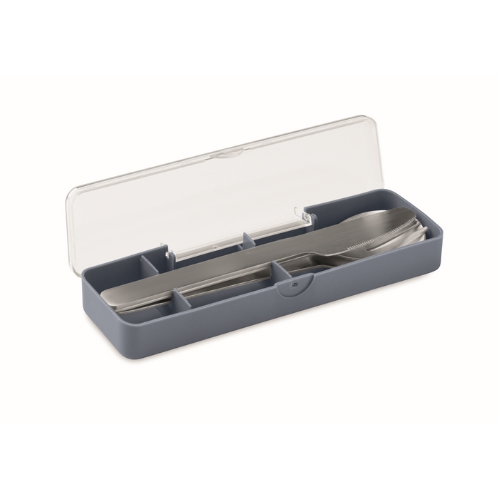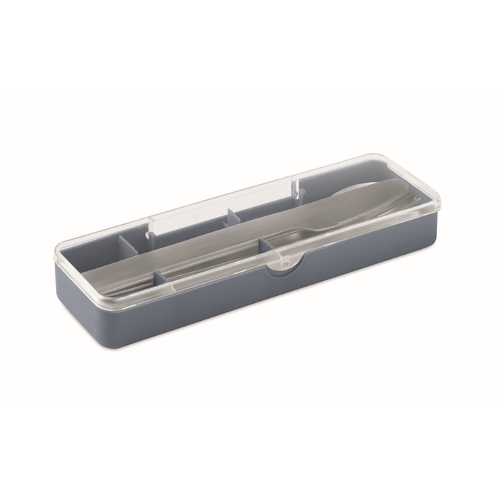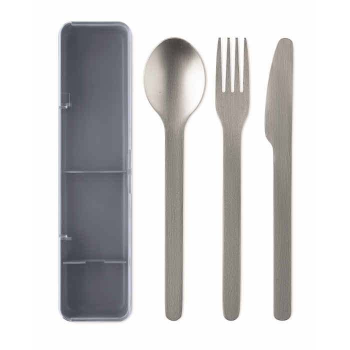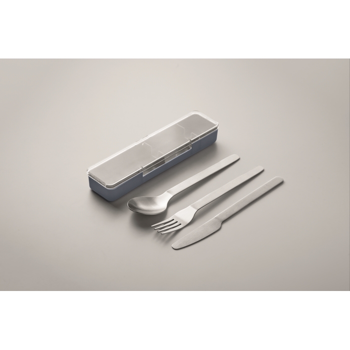 Sada příborů z nerezové oceli v pouzdru z PP. Obsahuje vidličku, nůž a lžíci. Rozměry: 19.5 x 5.2 x 2 cm