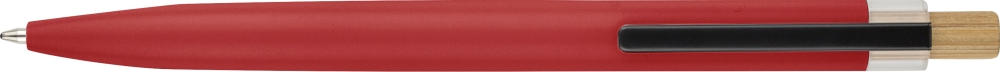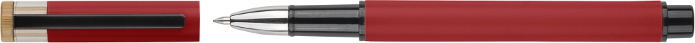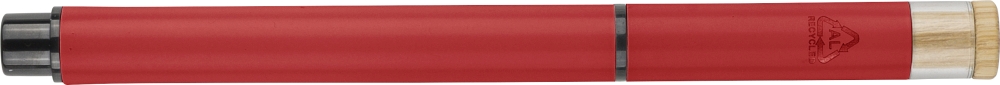 Sada lakovaných per z recyklovaného hliníku s kuličkovým a rollerovým perem. Bambusové tlačítko, rPET lem a kovový klip; roller obsahuje bambusový/rPET detail víčka a odpovídající klip. Obě pera s gravírovaným logem z recyklovaného materiálu. Píše přibližně 700 m (kuličkové pero) a 500 m (roller). Modrý inkoust. Baleno v barevné dárkové krabičce z recyklovaného kartonu. Rozměry: 1,4 cm x 17,8 cm