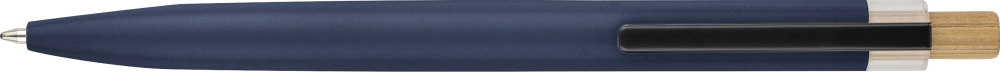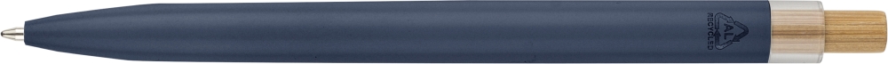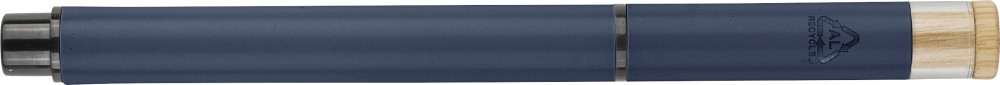 Sada lakovaných per z recyklovaného hliníku s kuličkovým a rollerovým perem. Bambusové tlačítko, rPET lem a kovový klip; roller obsahuje bambusový/rPET detail víčka a odpovídající klip. Obě pera s gravírovaným logem z recyklovaného materiálu. Píše přibližně 700 m (kuličkové pero) a 500 m (roller). Modrý inkoust. Baleno v barevné dárkové krabičce z recyklovaného kartonu. Rozměry: 1,4 cm x 17,8 cm