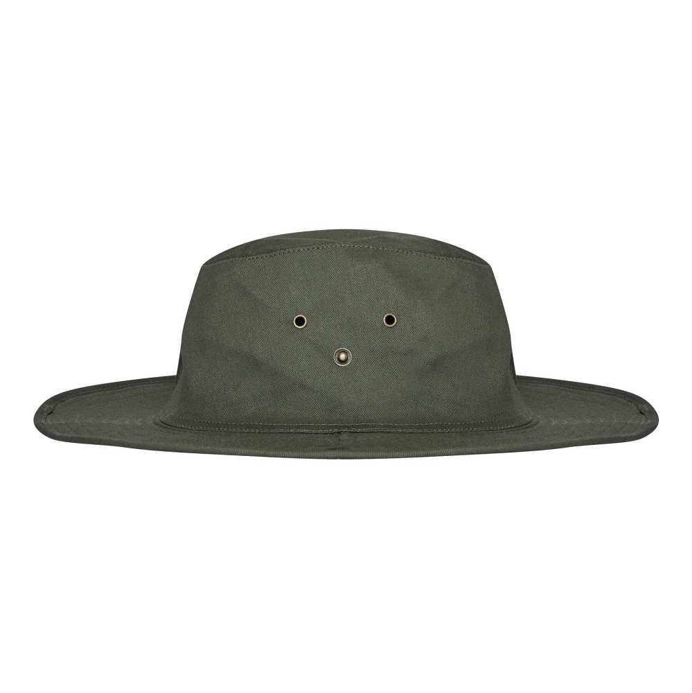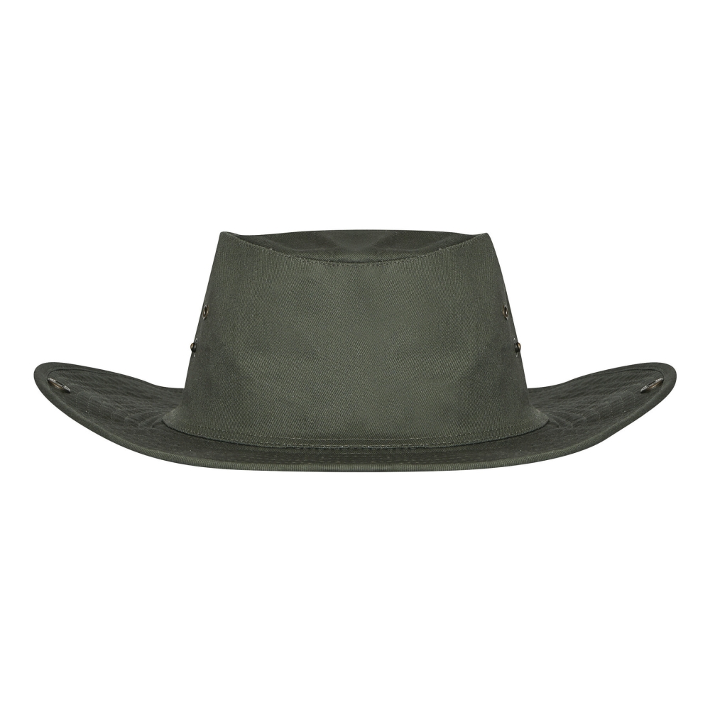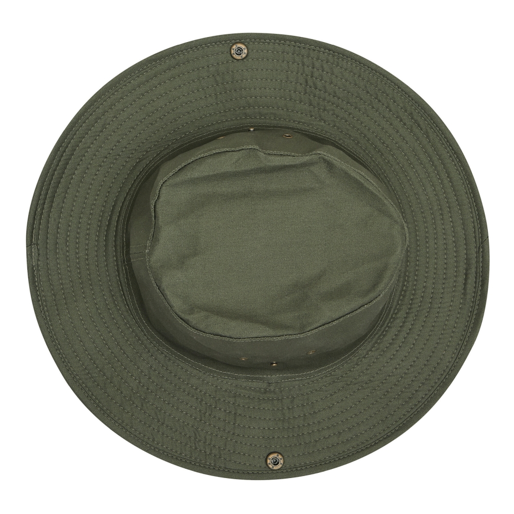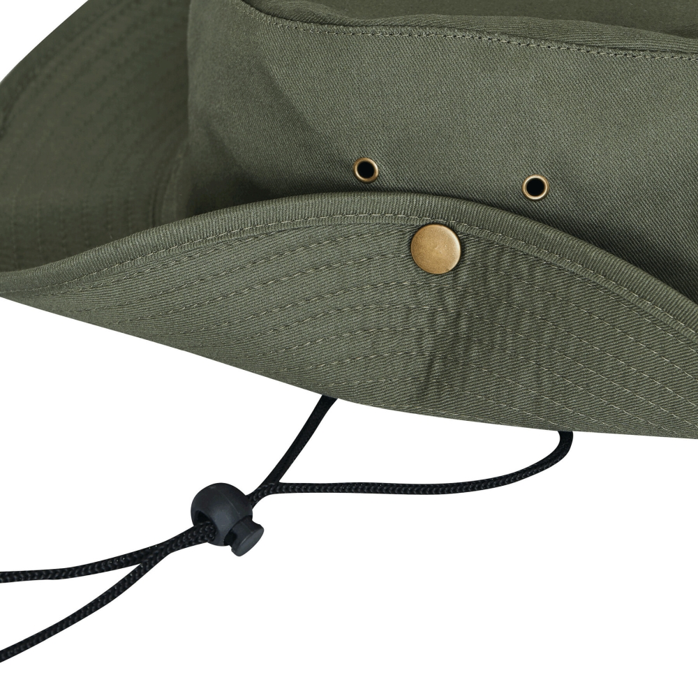 Safari klobouk: okraj lze bočně ohrnout pomocí druků, 4 kovové větrací otvory, pásek pod bradu s plastovou zarážkou pro nastavení velikosti.
