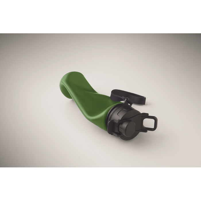 Skládací silikonová sportovní láhev s PP víčkem, rukojetí, polyesterovým popruhem a průhlednou sponou pro zajištění ve složeném stavu. Objem: 500 ml. Rozměry: O6.7 x 24 cm