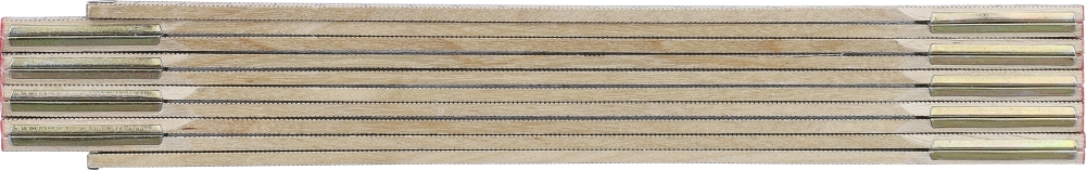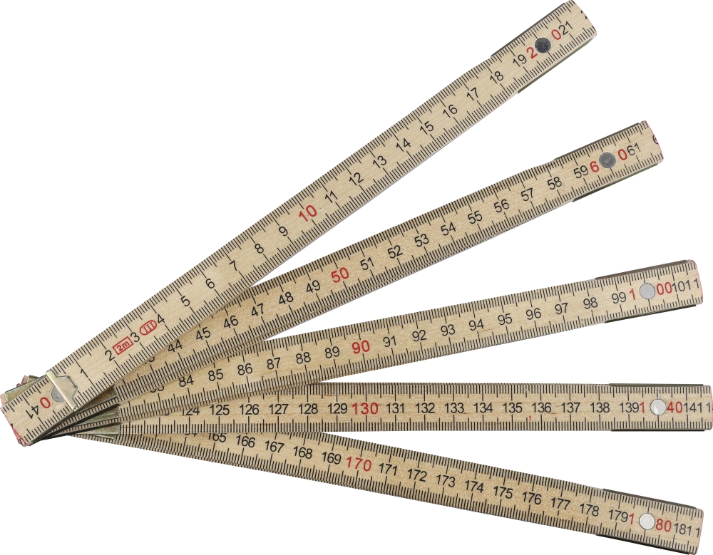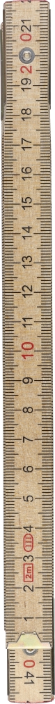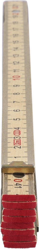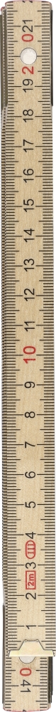 Skládací metr z březového dřeva s centimetrovou indikací a délkou 2 metry. Skládá se z 10 segmentů s ocelovými panty pro odolnost a stabilitu, včetně rohového zámku pro bezpečné použití. Dodáváno v papírovém obalu. Rozměry: 3,5 cm x 23,5 cm