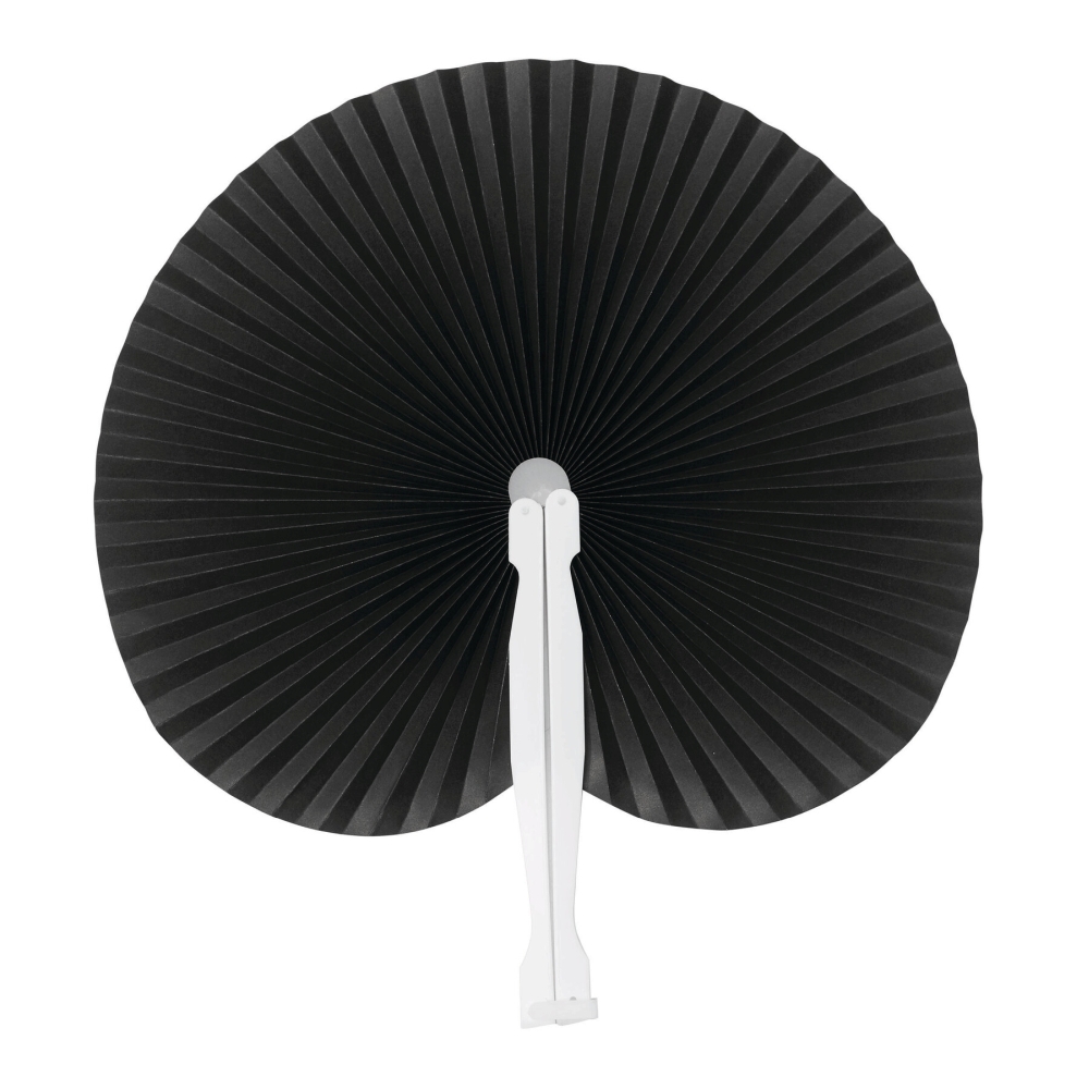 Skládací papírový vějíř, upevněný na odolné plastové rukojeti s uzavírací sponou. Rozměry: 24 x 26 / 14,5 x 2 cm