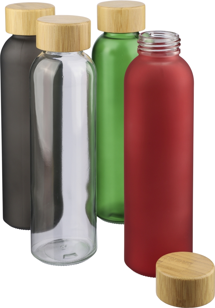 Skleněná láhev na pití (500 ml) s matným tělem a bambusovým šroubovacím víčkem s vnitřním jádrem z PP. Vyrobeno ze sodno-vápenatého skla, vhodné pouze pro studené nápoje. Jednotlivě baleno v hnědé kartonové krabici. Rozměry: 6,3 cm x 23 cm