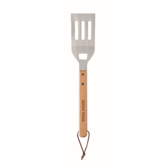 Grilovací špachtle s otvírákem na lahve. Vyrobeno z nerezové oceli s rukojetí z bukového dřeva. Poutko z PU pro snadné skladování. Rozměry: 36.9 x 7.2 x 1.6 cm