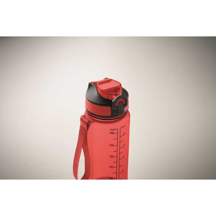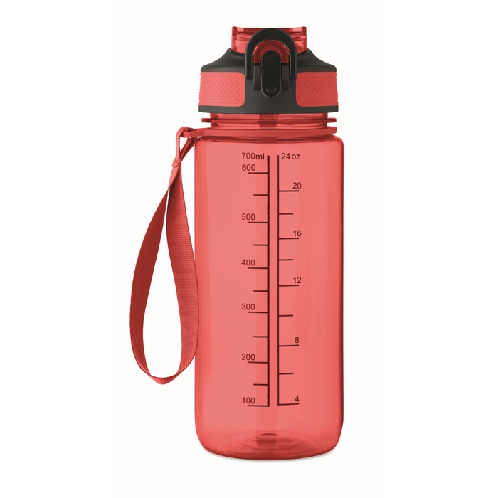 Motivační sportovní láhev na vodu z RPET s integrovaným brčkem, měkkým silikonovým náustkem, víčkem otevíratelným jednou rukou a bezpečnostním zámkem. Poutko z RPET saténu. Objem 700 ml. Neteče. Rozměry: O7.7 x 21.5 cm
