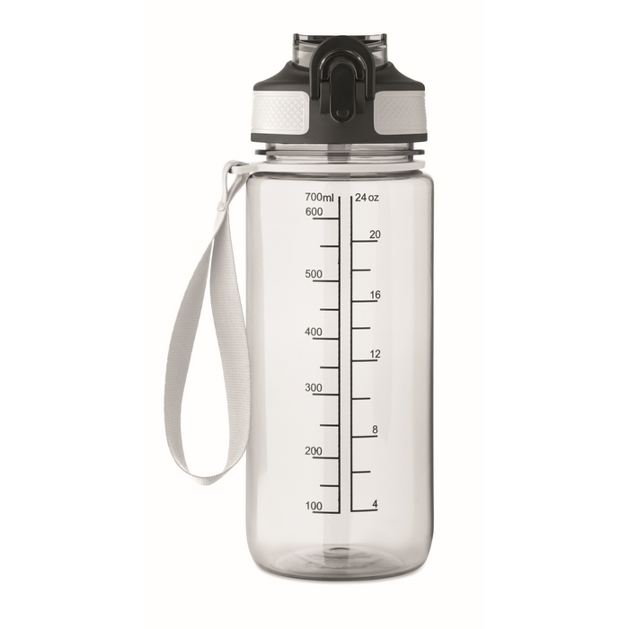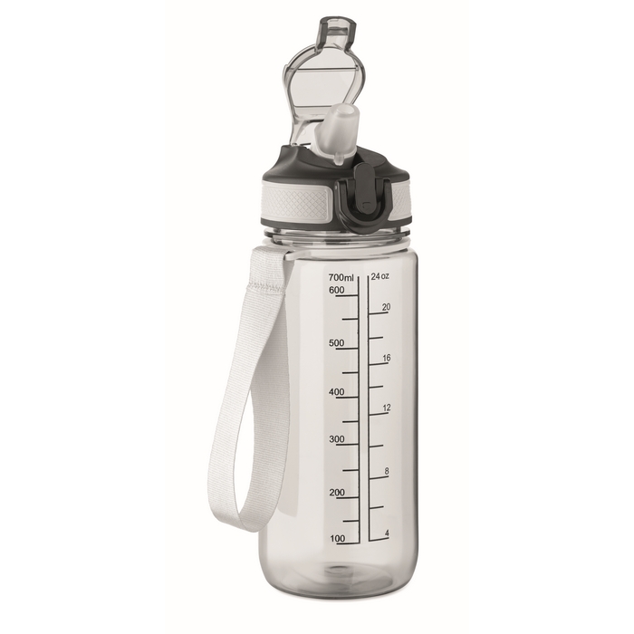 Motivační sportovní láhev na vodu z RPET s integrovaným brčkem, měkkým silikonovým náustkem, víčkem otevíratelným jednou rukou a bezpečnostním zámkem. Poutko z RPET saténu. Objem 700 ml. Neteče. Rozměry: O7.7 x 21.5 cm